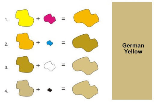 Bước 2: Cách pha màu sơn tường pha màu cơ bản gần giống đó. Bạn có thể hình dung như hình trên là pha màu cam. Thì chúng ta pha vàng với hồng cánh sen là được.