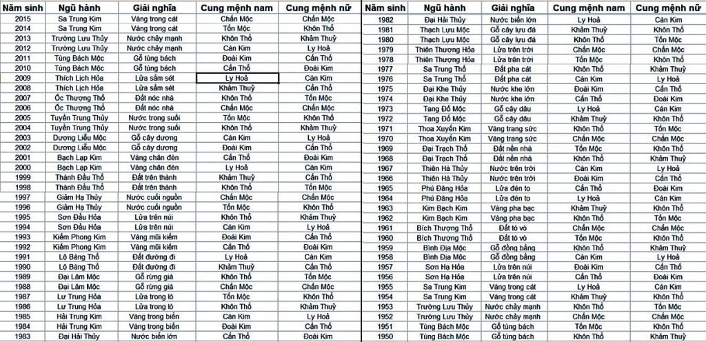Để chọn màu sơn nhà đẹp hợp mệnh phong thủy, đầu tiên bạn cần quan tâm mình sinh năm bao nhiêu để xác định mệnh của bản thân và các thành viên trong gia đình theo bảng sau: